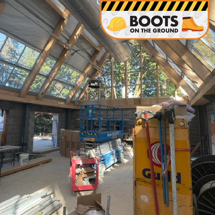 Conservatory Greenhouse 📷 Pictured: The Greenhouse Conservatory is taking shape. Here, you can see the glass roof and mass timber framework. The powered blinds will operate automatically to shade neighbours from night-time light in the greenhouse.